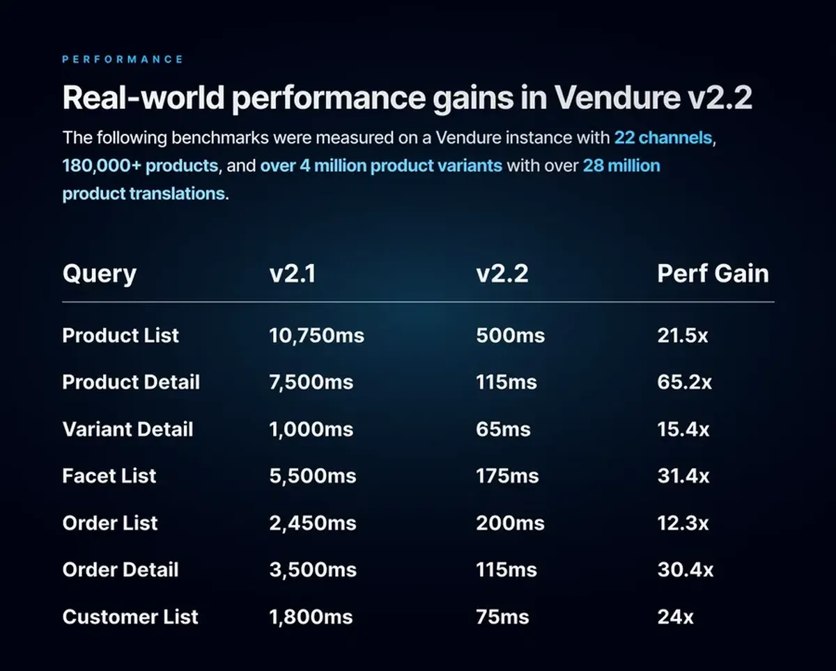 Vendure 2.2.0 updates every major dependency to the latest versions. Most significantly, a major update to our data-access layer has resulted in massive improvements for applications with a very large number of products, customers, and orders.