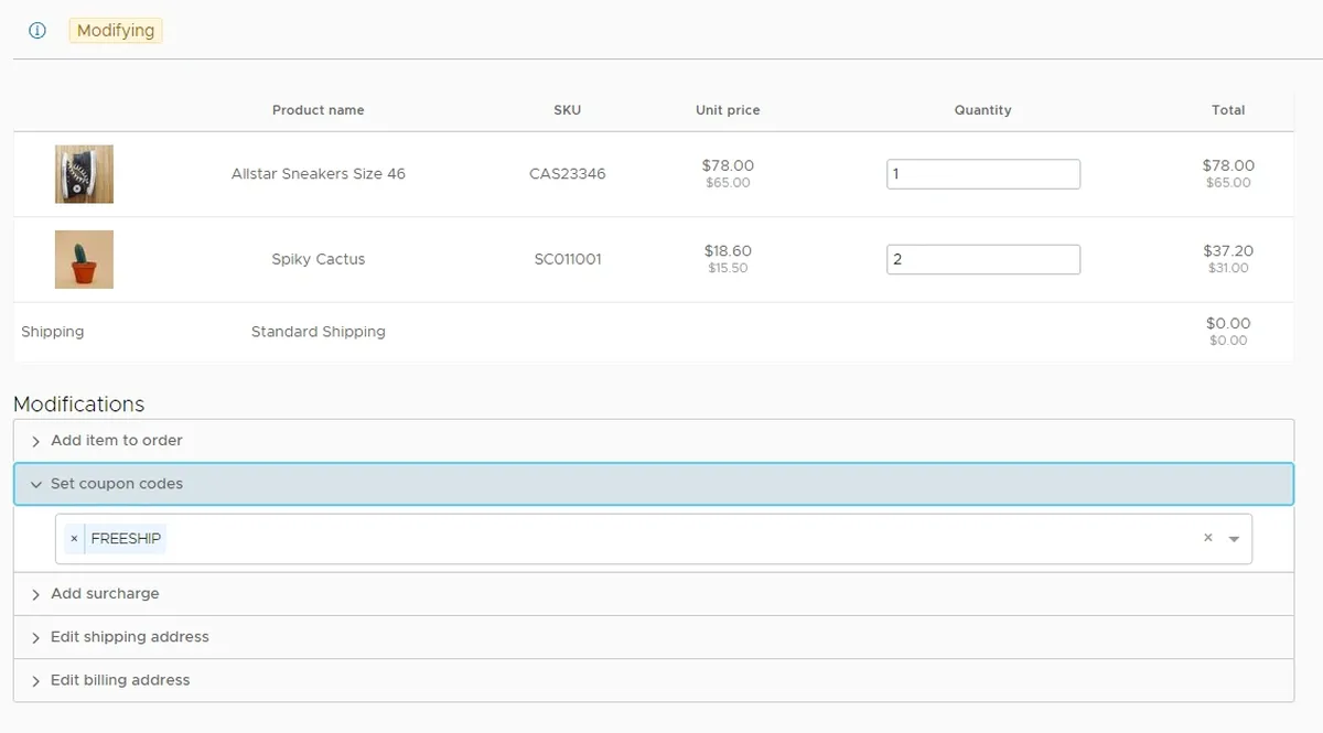 When modifying an existing Order, you can now add or remove coupon codes. This allows you to apply or remove Promotions after an Order has been placed. Since changes to the applied Promotions will result in a change in the Order total, the Order modification flow will also account for automatic refunds as well as the ability to add additional payments.
