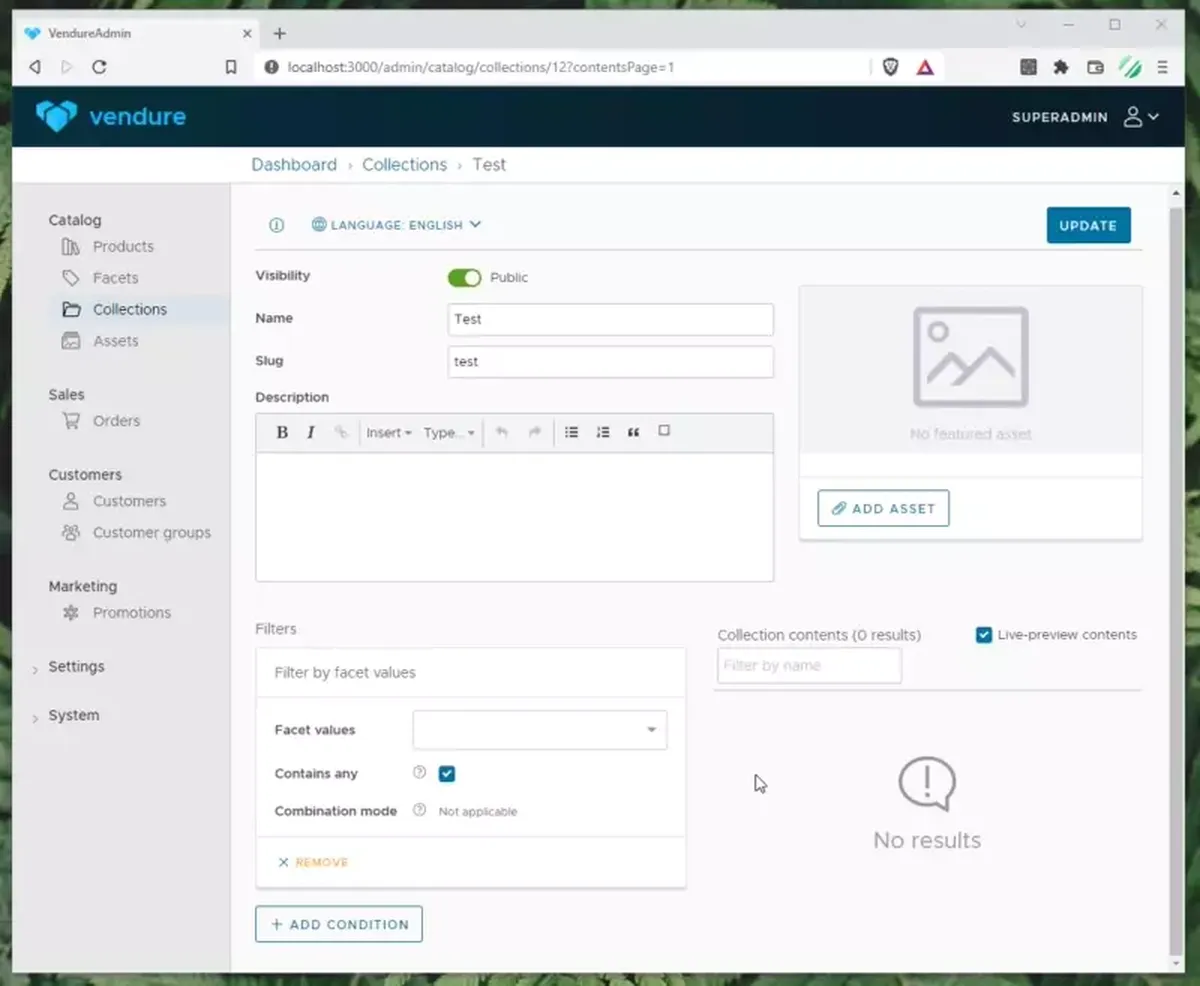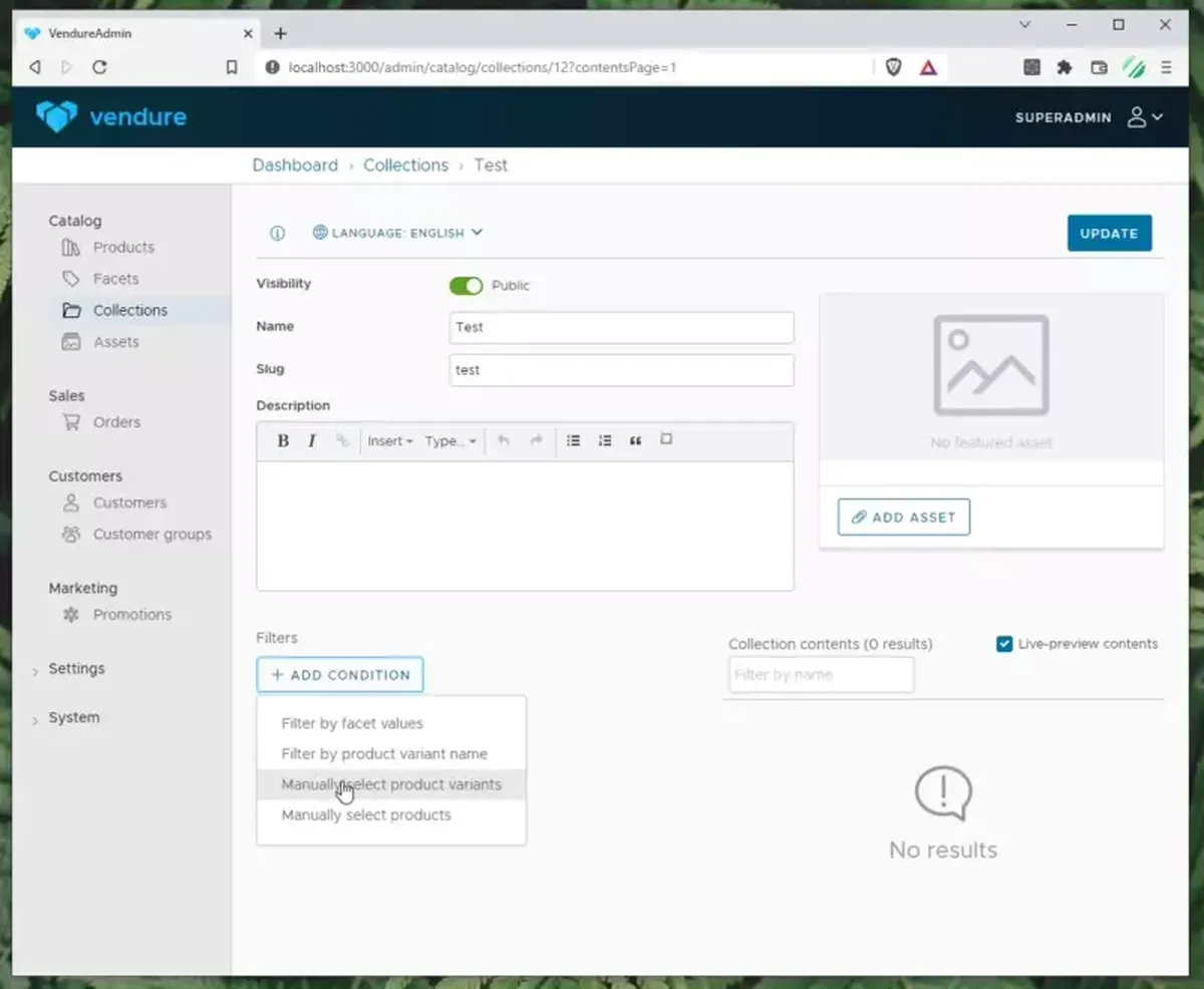 With Vendure v1.6, you can live-preview the contents of your Collection as you configure your filters, in real time! This takes all the guesswork out of constructing your filters, and ensures you have the perfect configuration set up before hitting "save".