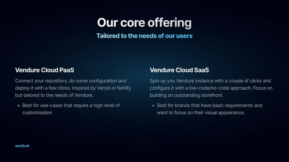 With Vendure Cloud SaaS, you'll be able to spin up a Vendure instance via a web interface and configure things using a low-code/no-code approach. This is ideal for brands that have basic requirements and want to focus on building an outstanding storefront.