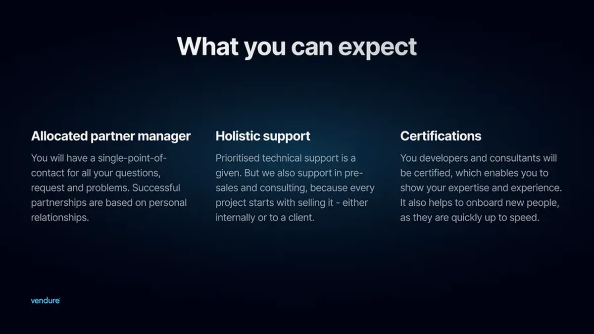 With our new Partner Program we will build a network of skilled and innovative partners around the globe. We explored the idea of a partner program last year but soon realized we were missing something. The interest was there - we have over 70 partners already lined up! - but we lacked the resources on our side to build a program that truly fit our vision of what such a program should look like. In our view, a partnership is more than just a badge - it means providing real mutual value to the benefit of our partners and the broader Vendure community.