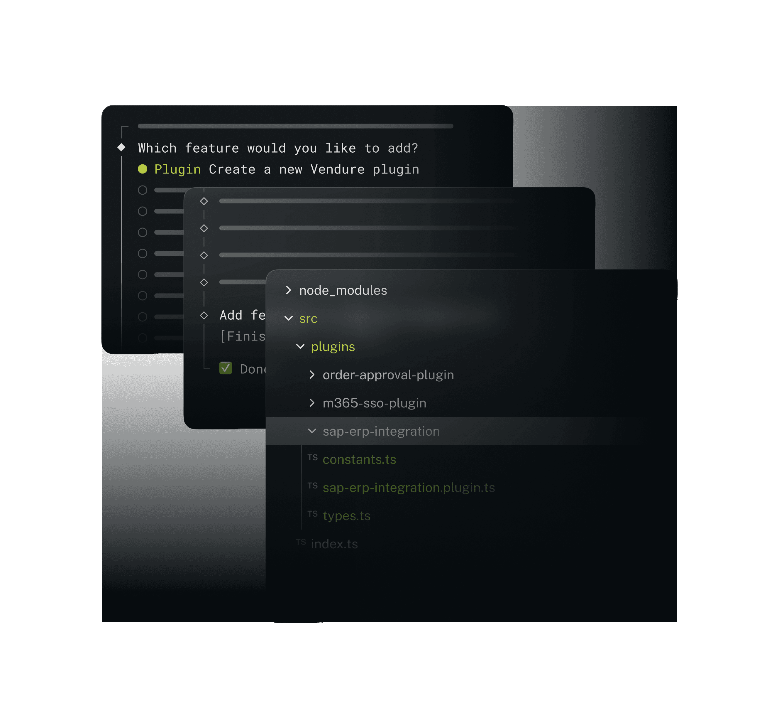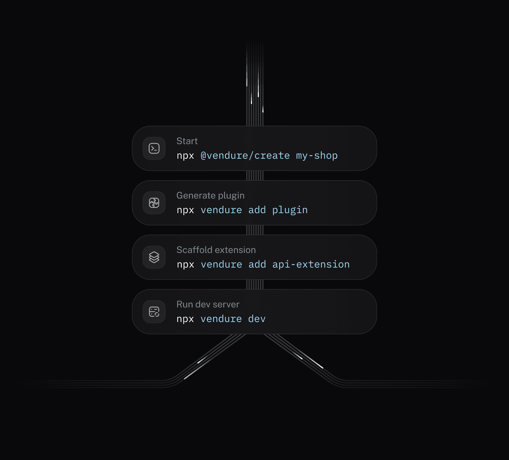 Commerce infrastructure is complex. Vendure’s tooling helps your team move faster—with intuitive scaffolding, automation-ready APIs, and a developer-first design. We’ve built Vendure to be a joy to work with. From generating new plugins in seconds to managing admin extensions or CRUD operations, the CLI and SDK reduce repetitive work and enforce best practices—without getting in your way. Whether you're a solo developer or working across a large platform team, these tools make scaling easier.